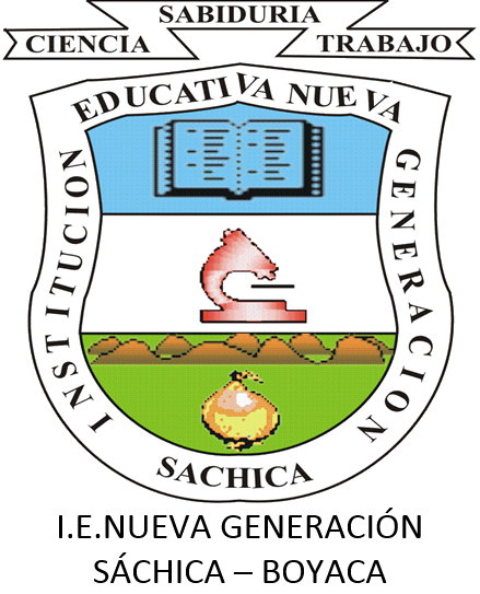 El Escudo posee la forma tradicional del español acinturado, con las franjas y colores de la bandera de la Institución dentro. Sobre el azul, en alto relieve, un libro abierto, como muestra de la intelectualidad y la vocación académica; sobre el blanco, en alto relieve, la efigie de un microscopio, señal del énfasis en Ciencias Naturales y la orientación científica de los proyectos institucionales; sobre el verde, también en alto relieve, un fruto de cebolla cabezona híbrida amarilla, principal producto de la época, como símbolo de la vocación agrícola de las familias de los estudiantes. Alrededor del Escudo, se lee la denominación oficial del plantel: “INSTITUCION EDUCATIVA NUEVA GENERACION”, en letras negras, mayúsculas, sobre una franja perimetral blanca. En la parte superior una cinta ondulante en tres secciones, en cada una de las cuales, de izquierda a derecha se leen las palabras: “CIENCIA”, “SABIDURIA”, “TRABAJO”, claves para la formación de ciudadanos íntegros.